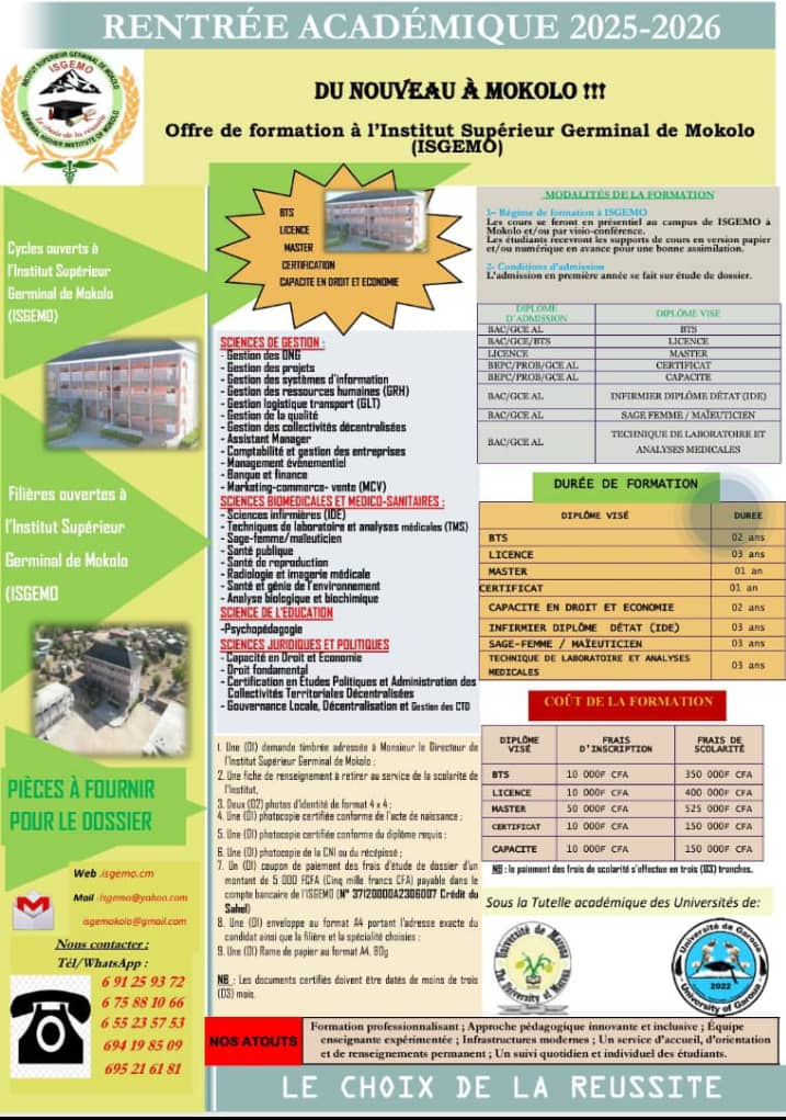L'Institut Supérieur Germinal de Mokolo vous ouvre ses portes pour la prochaine rentrée académique. Les futurs bacheliers et GCE A/L sont attendus. Consultez pour plus d'informations.